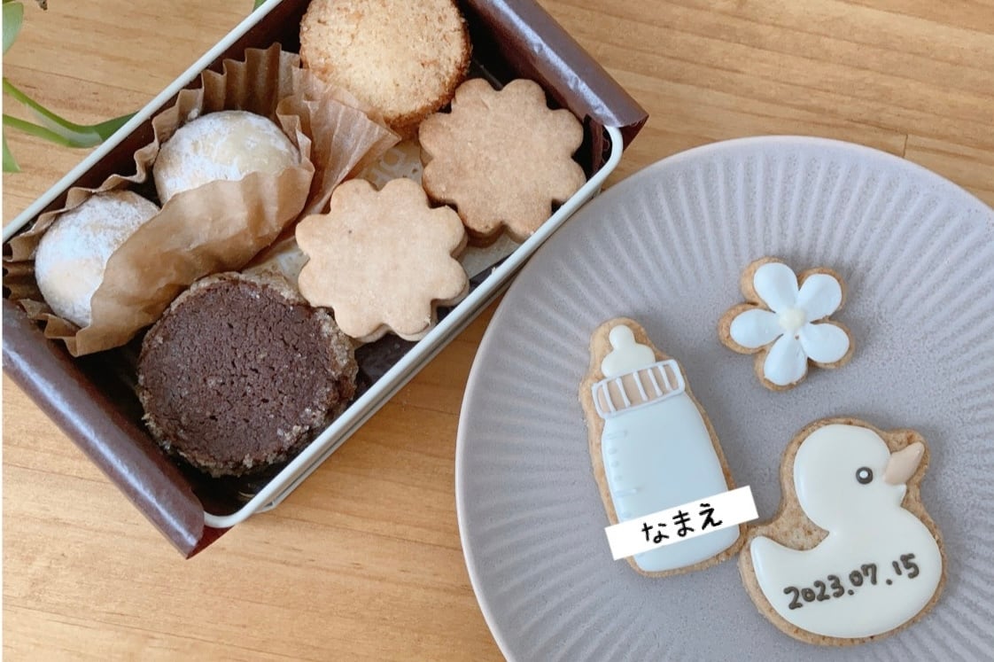 やや小ぶり、横12センチほどのミルクアイボリー缶に、焼菓子とアイシングクッキーを詰めたクッキー缶です。